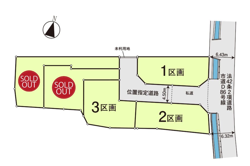 | 備考 | 各区画私道持分43.71㎡×1/5、89.73㎡×1/5、未利用地1.13㎡×1/5、都市計画道路日・3・4・12号該当あり、河川占用費用負担あり |